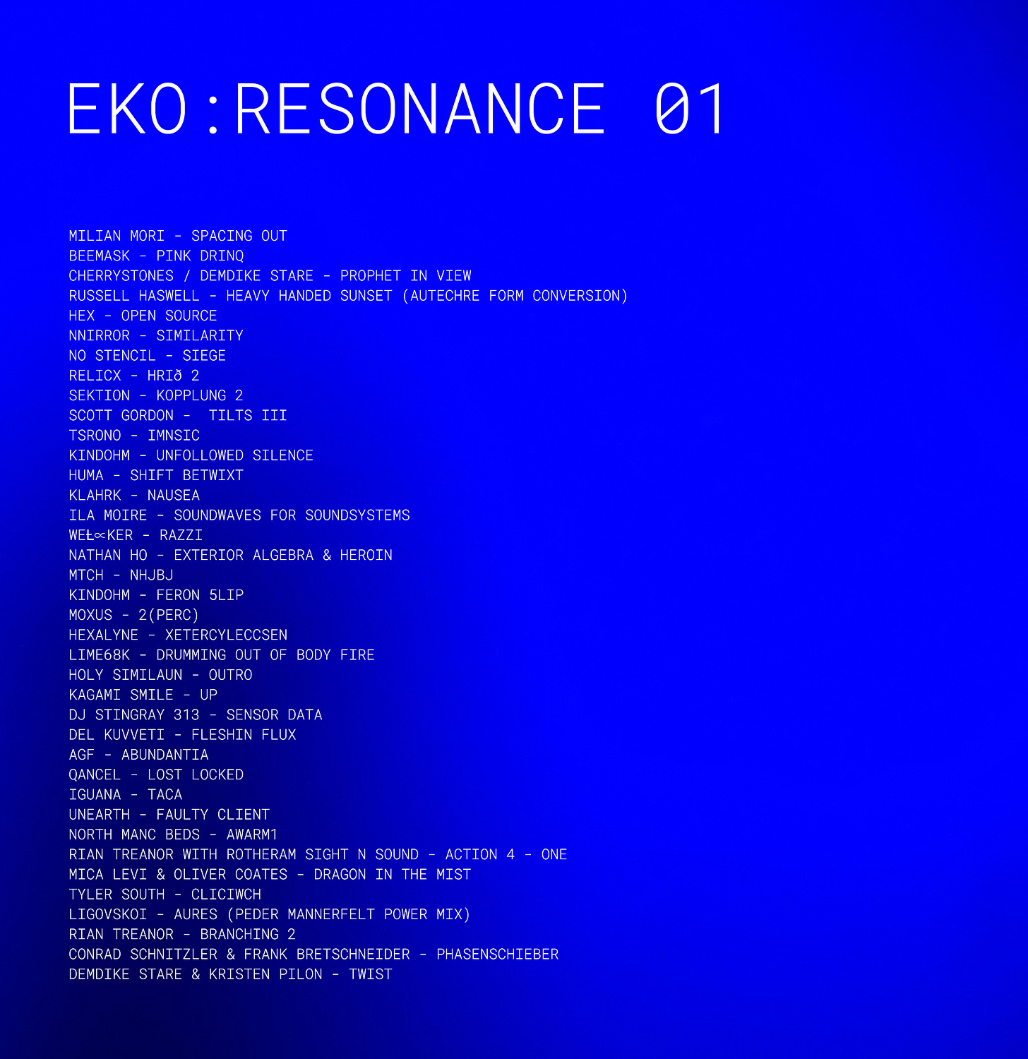 I’ll be releasing new music as Eko later in the year, on one of my favourite experimental labels. Until then, I will be using these mixes as a way of communicating. Thanks for listening to this first session. I’ll return next month with part two.